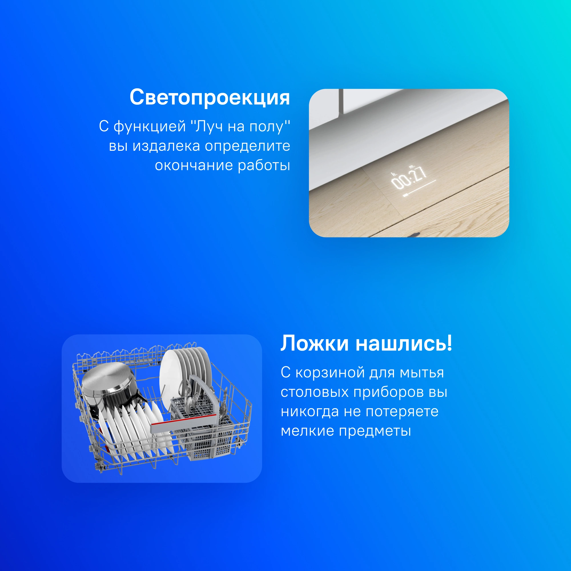 времени до конца программы, луч на полу, наличия ополаскивателя, наличия соли, режима работы