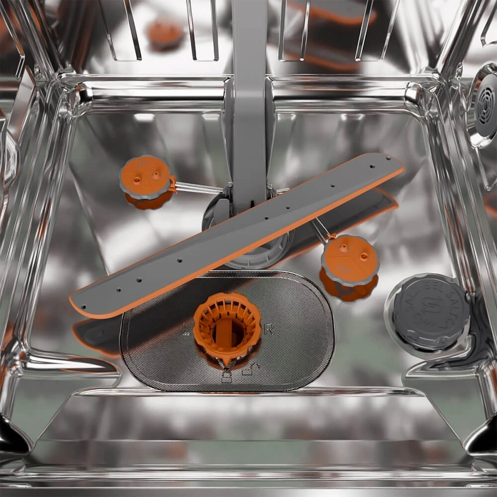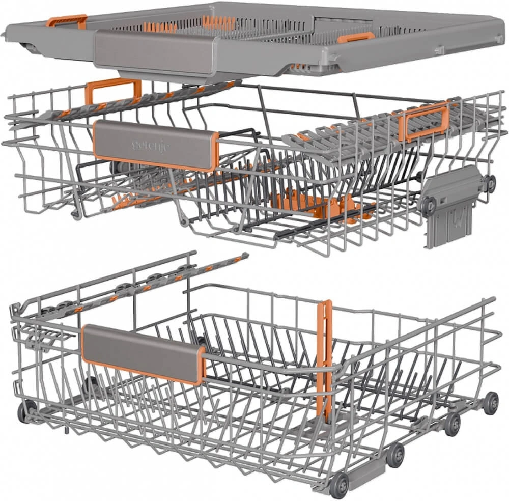 корзина для столовых приборов, освещение, полки для кружек, разбрызгиватель над верхней корзиной, регулируемая по высоте корзина для посуды, складные держатели тарелок